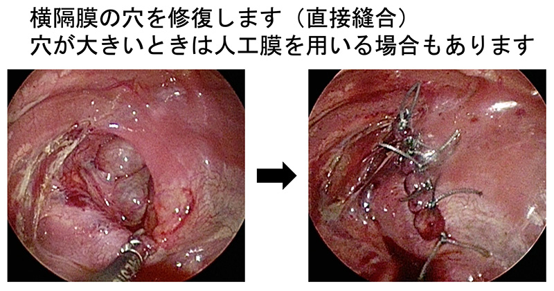 手術では、胸(胸腔内)に脱出した臓器(肝臓、胃、小腸、大腸、脾臓など)を確認のうえ、これらをおなか(腹腔内)に戻したうえで、横隔膜にあいた穴を修復します。穴が小さい場合は横隔膜を直接縫合して閉鎖、大きい場合は人工膜を用いて閉鎖を行います。状態が安定している患者さんでは、傷の小さな胸腔鏡手術を積極的に行なっています。穴が大きく重症な場合は、胎児期に治療を行う事があります。