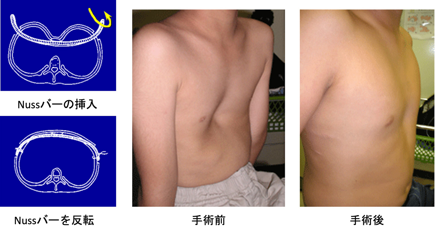 肋軟骨の左右非対称が強い症例については、上記のNuss法だけでは良好な胸郭の形成が難しい場合があります。よりよい形態で胸郭を形成するため、ご本人の病状に合わせて、Nuss法以外の方法(Ravich変法、肋軟骨切除法、脂肪注入等)を担当医がご提案します。
